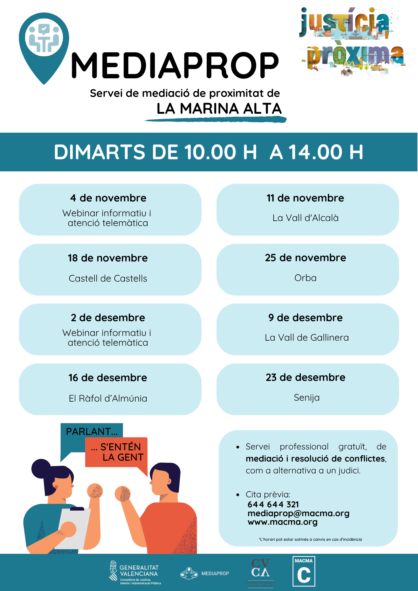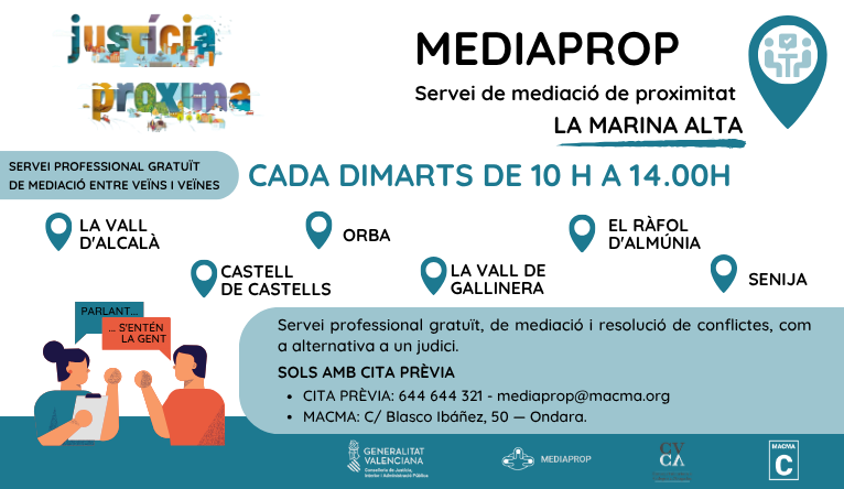 A partir del 15 d’octubre s’iniciarà l’atenció del servei comarcal de MEDIAPROP. Els dimarts, de 10.00 a 14.00 h, s'oferirà aquest servei de mediació (en castellà, valencià, francés i anglés) de proximitat obert a la ciutadania en general i que donarà cobertura a les següents poblacions: Alcalalí, Beniarbeig, Benimeli, Benidoleig, Benigembla, Castell de Castells, El Ràfol d’Almúnia, El Poble Nou de Benitatxell, Els Poblets, El Verger, Gata de Gorgos, L’Atzúbia, La Llosa de Camatxo, La Vall d’Alcalà, La Vall d’Ebo, La Vall de Gallinera, La Vall de Laguar, Llíber, Murla, Orba, Parcent, Sagra, Sanet i Els Negrals, Senija i Xaló.