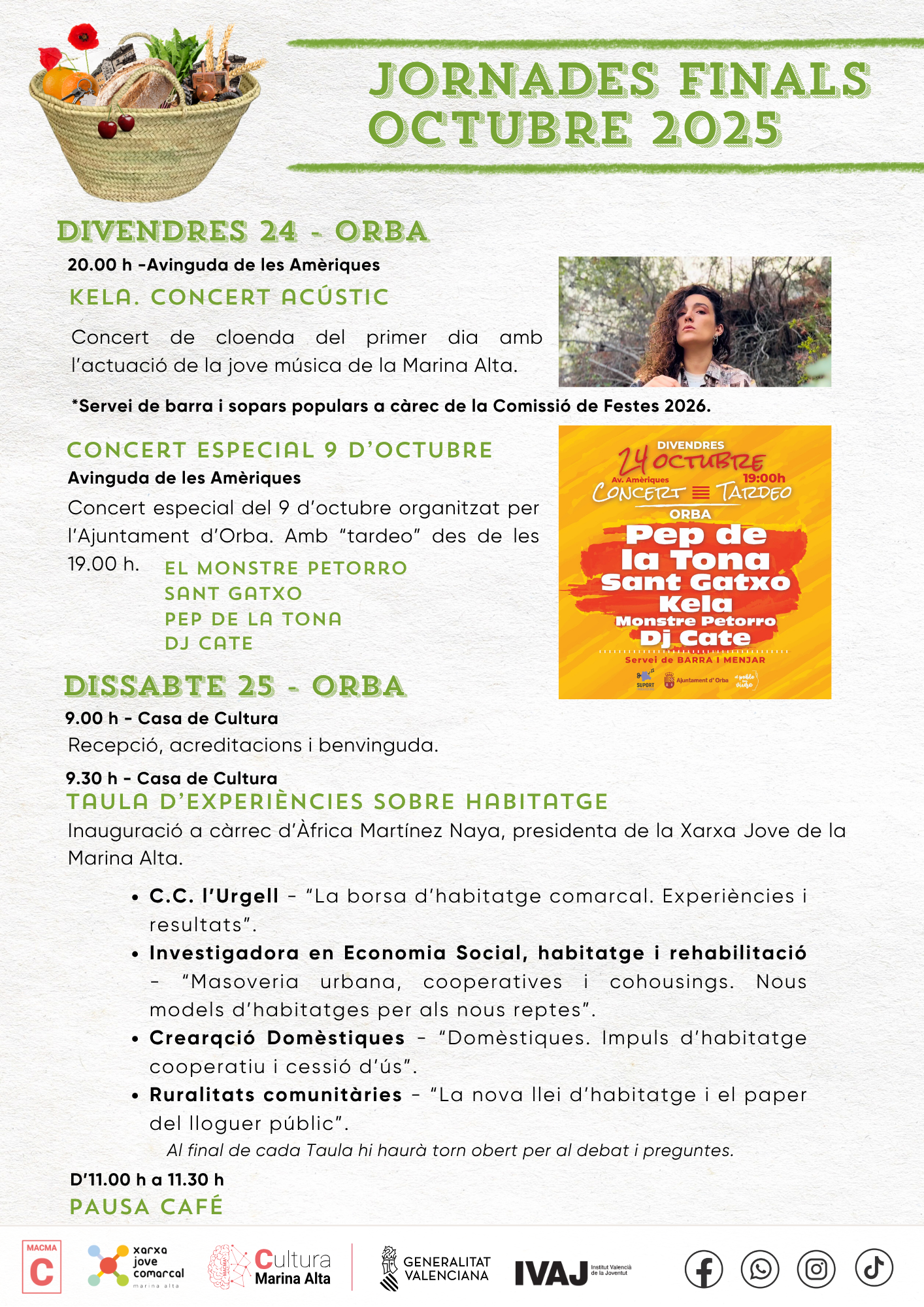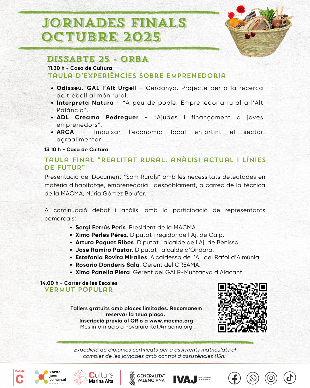 Després d’aquest primer cicle de taules de debat, on s’han abordat els principals reptes del món rural a la Marina Alta, arribarà el moment de fer un pas més. Els dies 24 i 25 d’octubre, el municipi d’Orba es convertirà en el centre de treball i proposta per a la Nova Ruralitat, transformant la reflexió en acció.