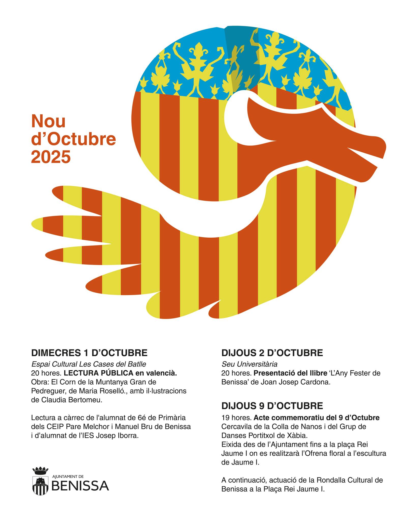 La celebració del 9 d'octubre a Benissa comença a partir de les 19.00 h amb una cercavila de la Colla de Nanos i del Grup de Danses Portitxol de Xàbia. Eixida des de l'Ajuntament fins a la plaça Rei Jaume I on es realitzarà l'Ofrena floral. A continuació, actuació de la Rondalla Cultural de Benissa.