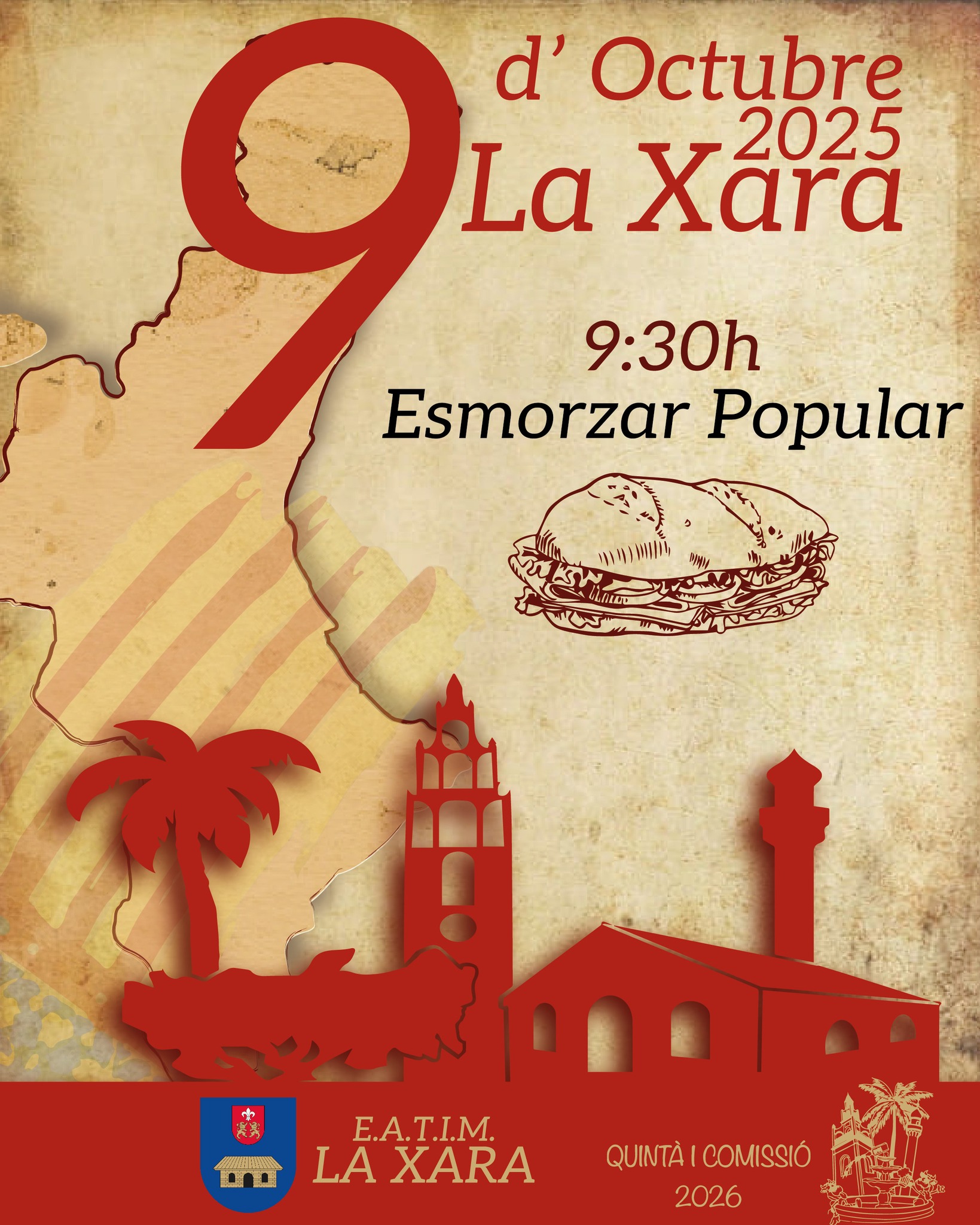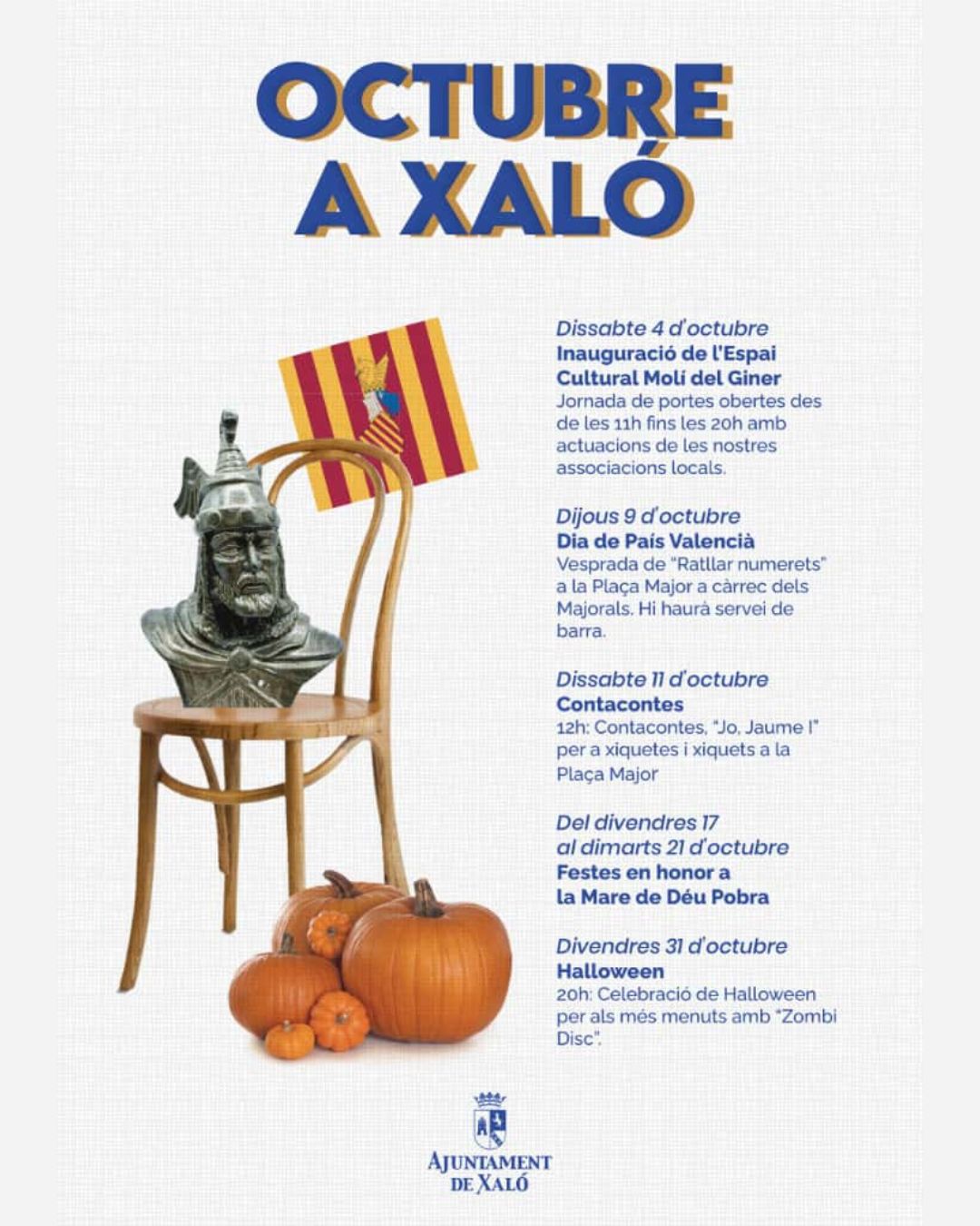 La celebració del 9 d'octubre a la Xara comença a partir de les 9.30 h a la plaça del cinema amb l'esmorzar popular, jocs tradicionals, danses i muixeranga. A les 10.00 h al c/Domènech amb la partida de Pilota Valenciana i finalitzara a les 14.00 h amb la paella gegant on podreu gaudir d'una obra de teatre, com no, en valencià!