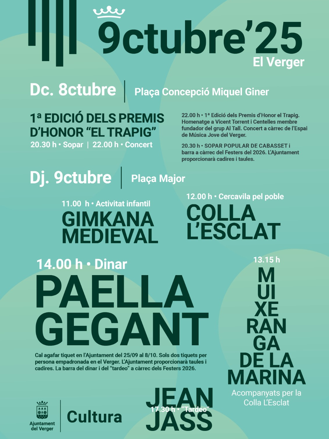 Celebrem el 9 d’Octubre al Verger. L’Ajuntament del Verger ha preparat una programació plena d’activitats per a gaudir en família i amb amics: música, tradició, cultura i moltes sorpreses!