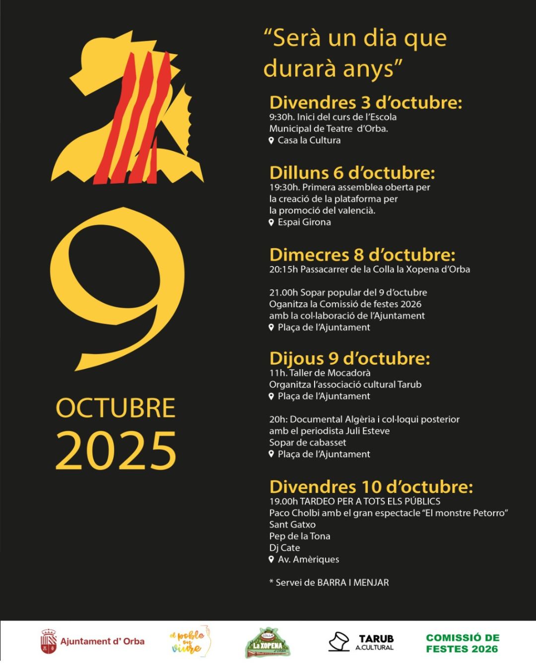 La celebració del 9 d'octubre a Orba baix el lema “Serà un dia que durarà anys” comença el divendres 3 amb l'inici del curs de l'Escola de Teatre, el dilluns 6 tindrà lloc la primera assemblea oberta per la creació de la plataforma per la promoció del valencià.