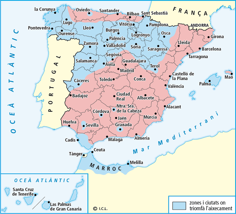 - De juliol de 1936 a març de 1937. El 18 de juliol de 1936 l’exèrcit d’Àfrica dirigit per Franco va travessar l’estret de Gibraltar. A Andalusia Queipo de Llano va ocupar Sevilla i l’Andalusia occidental. El general Mola s’imposà a Aragó, Navarra, Castella i Lleó i Galícia.