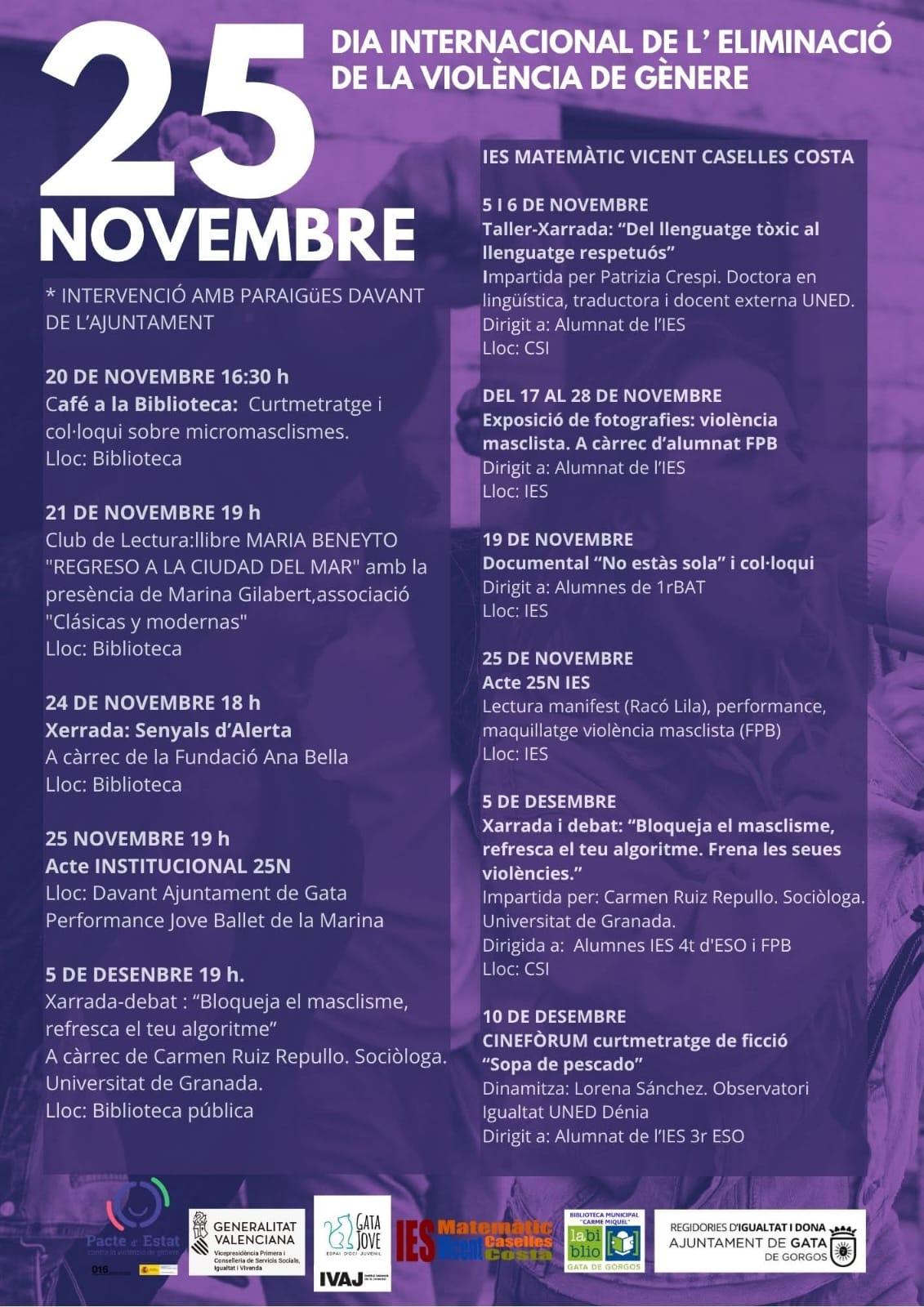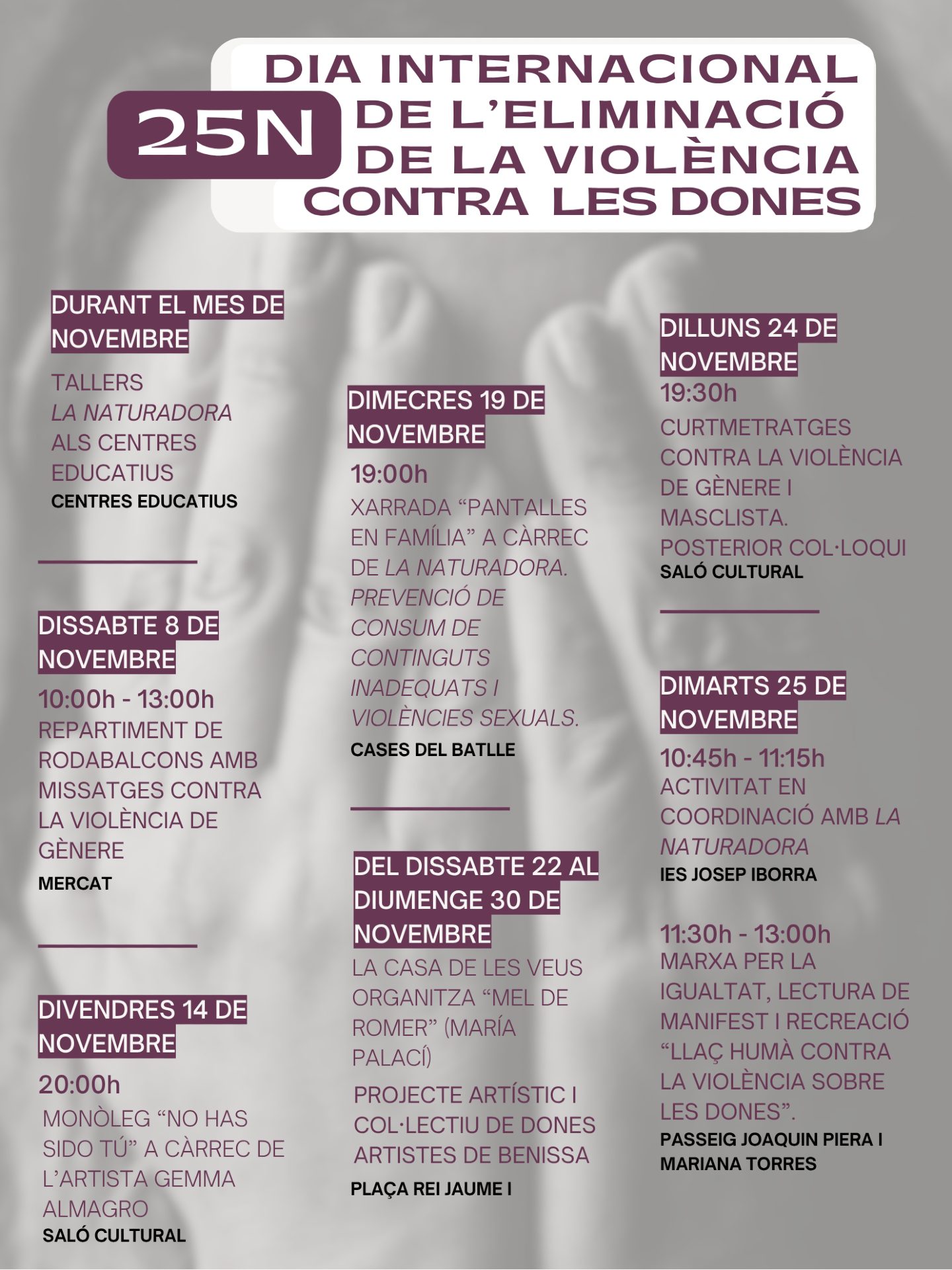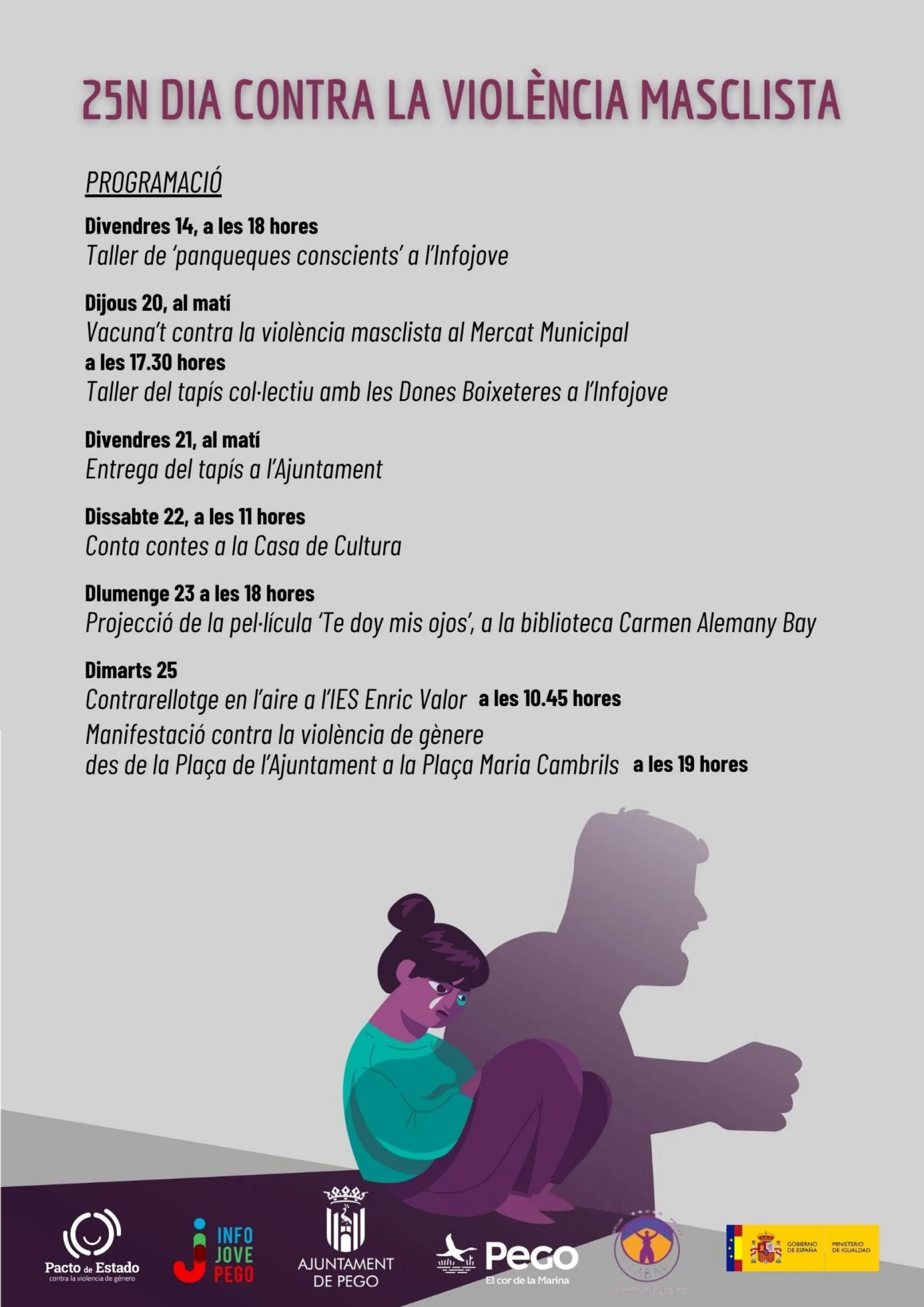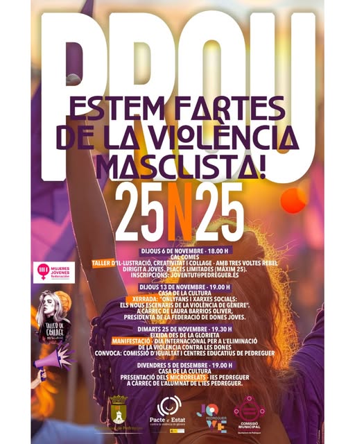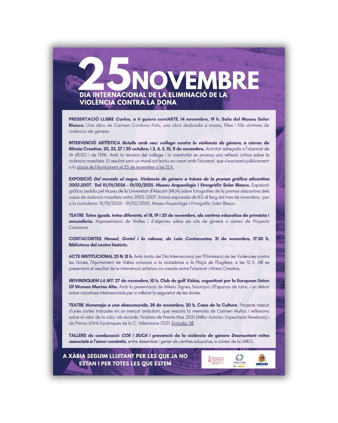 Durant el mes de novembre, a la Marina Alta es posa el focus en la lluita contra la violència masclista i dona visibilitat a aquesta problemàtica social mitjançant una sèrie d’activitats i iniciatives de sensibilització, reflexió i participació ciutadana, organitzades al voltant del 25 de novembre, Dia Internacional per a l’Eliminació de la Violència contra les Dones.