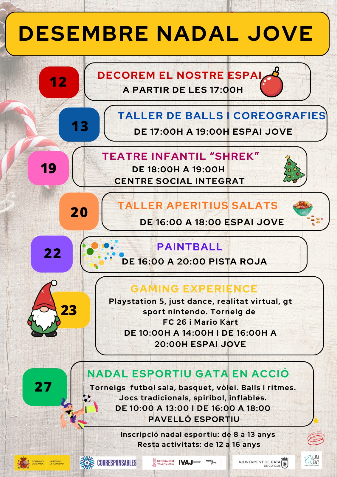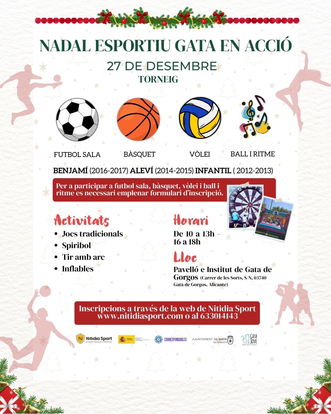 - Dissabte 27 de desembre: "Nadal Esportiu Gata en Acció" Dia de tornejos, de 10:00 a 13:00 i de 16:00 a 18:00 h al Pavelló i a l'IES Matemàtic Vicent Caselles Costa.