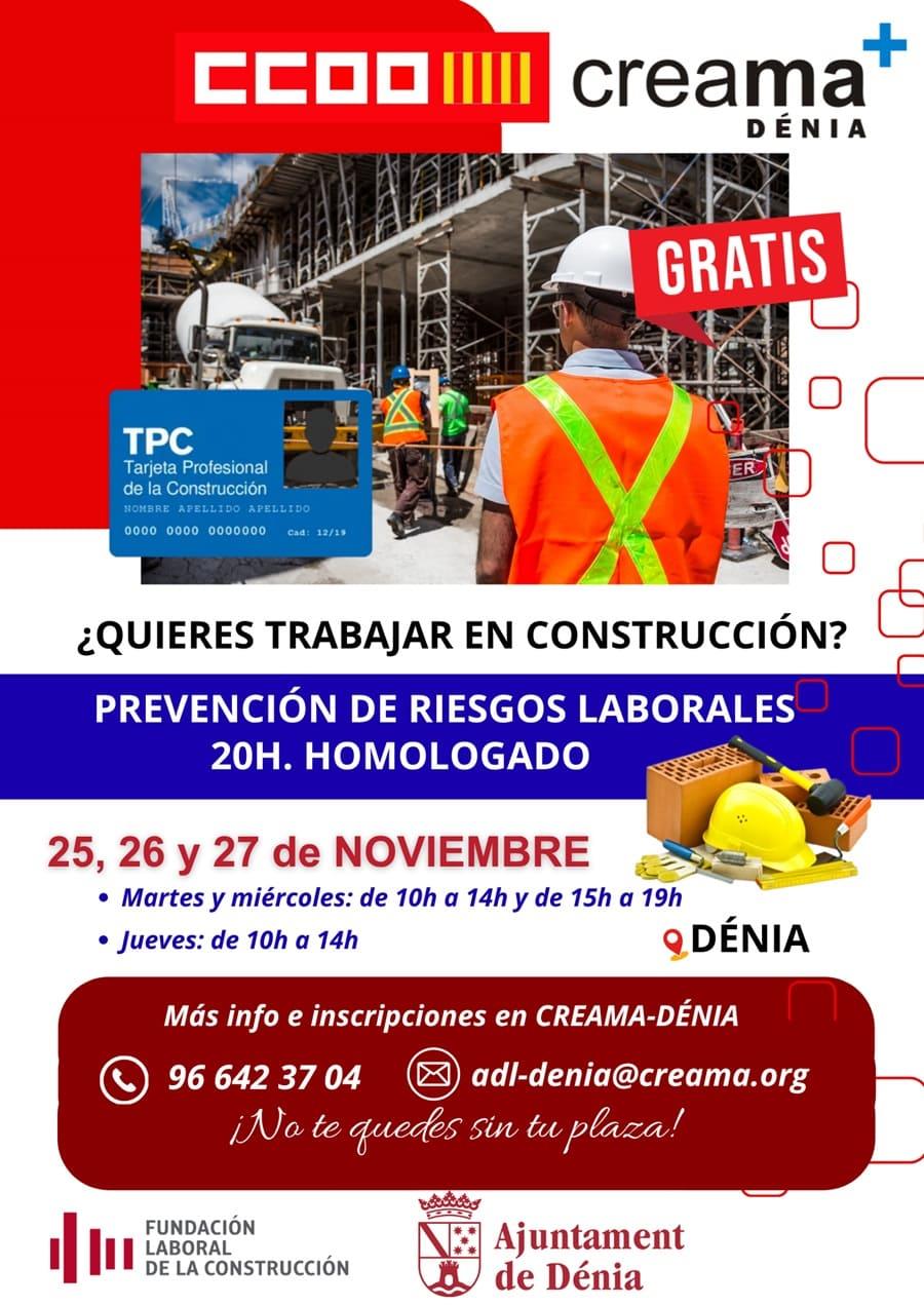 Curs gratuït de prevenció de riscs laborals, dirigit a persones que es dediquen a la construcció. Es realitzarà els dies 25, 26 i 27 de novembre en horari de 10:00 a 14:00 i de 15:00 a 19:00, l'últim dia sols hi haurà curs en horari de matí.