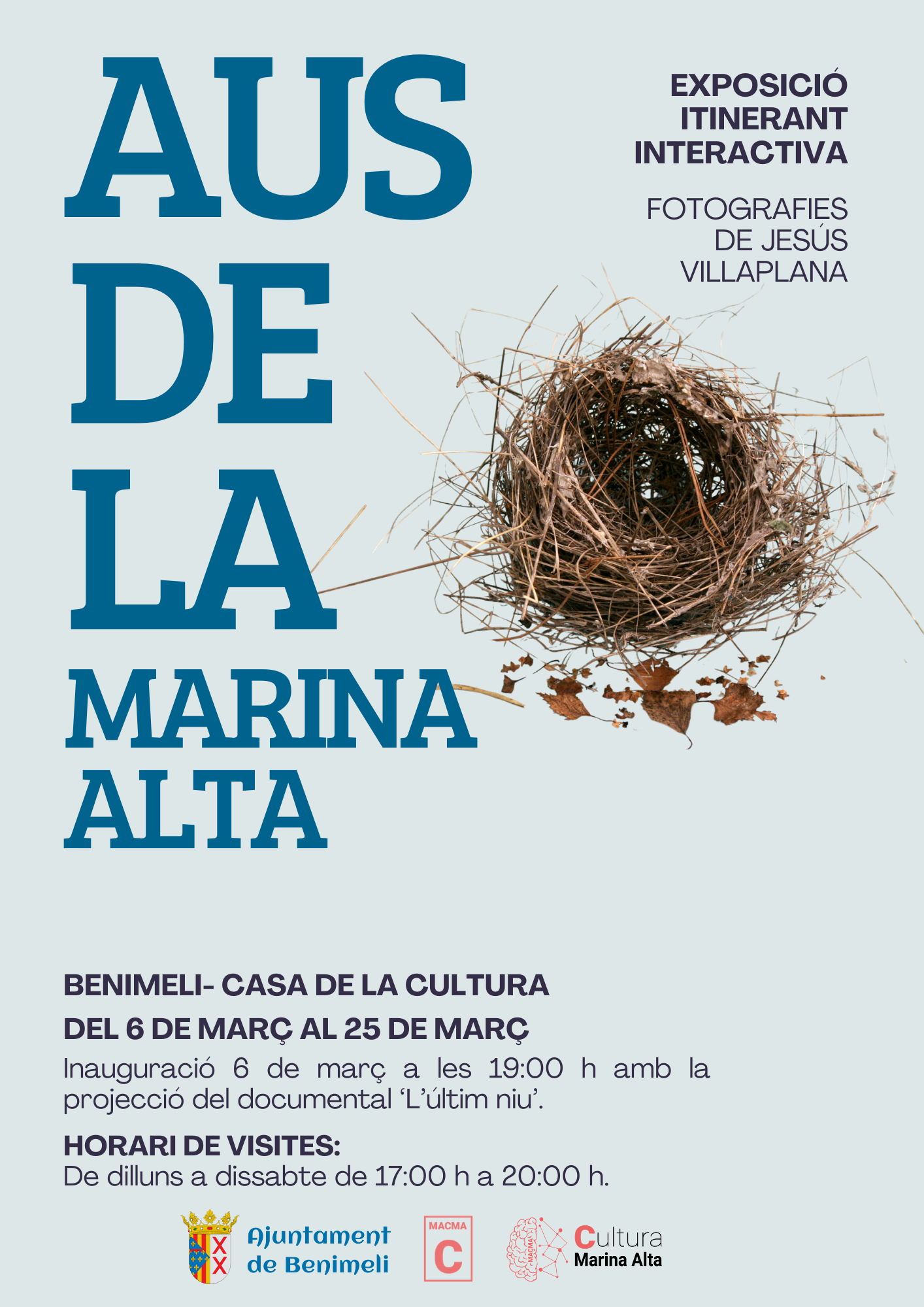L'exposició itinerant “Aus de la Marina Alta” és una iniciativa des de l’àrea de cultura i patrimoni de la MACMA, Mancomunitat Comarcal de la Marina Alta, dissenyada per a apropar la riquesa ornitològica de la comarca a un públic ampli i divers, alhora que donem a conéixer els diferents ecosistemes existents a la comarca.