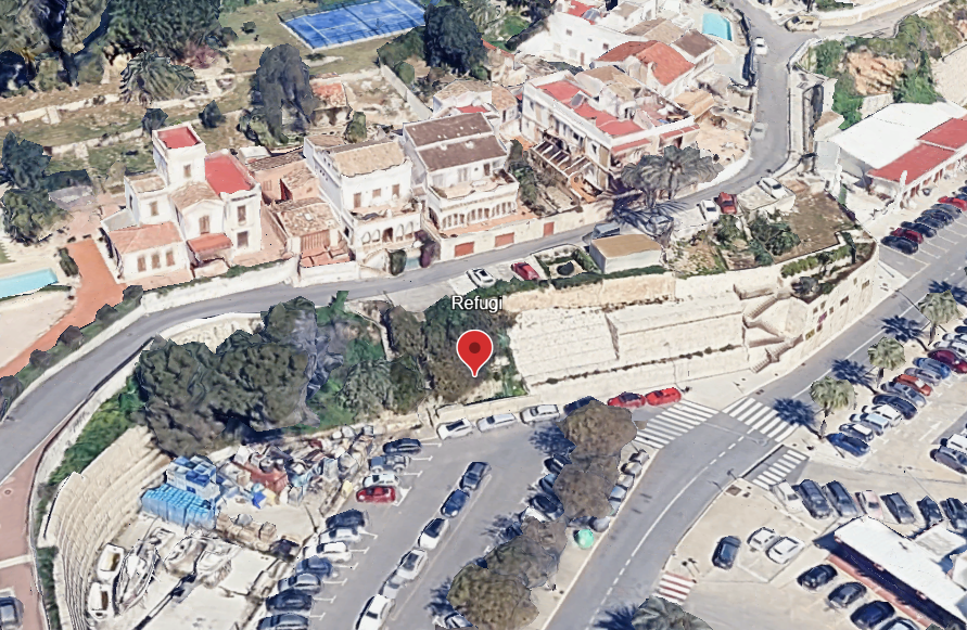 Casa Bolufer des de dalt. Foto de www.xabia.com. Seguirem passejant fins al barri de duanes del port per a visitar un refugi antiaeri, que recentment s'ha descubert que no s'utilitzava com a tal, sino com a magatzem de municions. És un poc dificil de trobar perquè el cobreixen un mur i la vegetació. En la següent foto, que mostra aquest refugi en els anys cinquanta, veme que estava vora l'aigua
