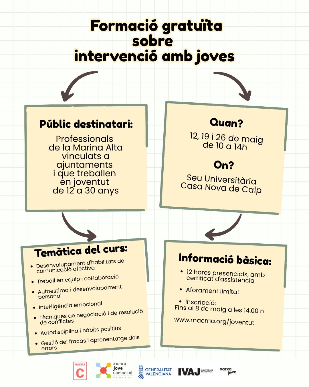 Sota aquesta consigna de formació professional, des de la Xarxa Jove de la MACMA s’ha organitzat el curs “Formació gratuïta sobre intervenció amb joves” a la Seu Universitària Casa Nova de Calp per als 12,19 i 26 de maig, de 10 a 14 h.