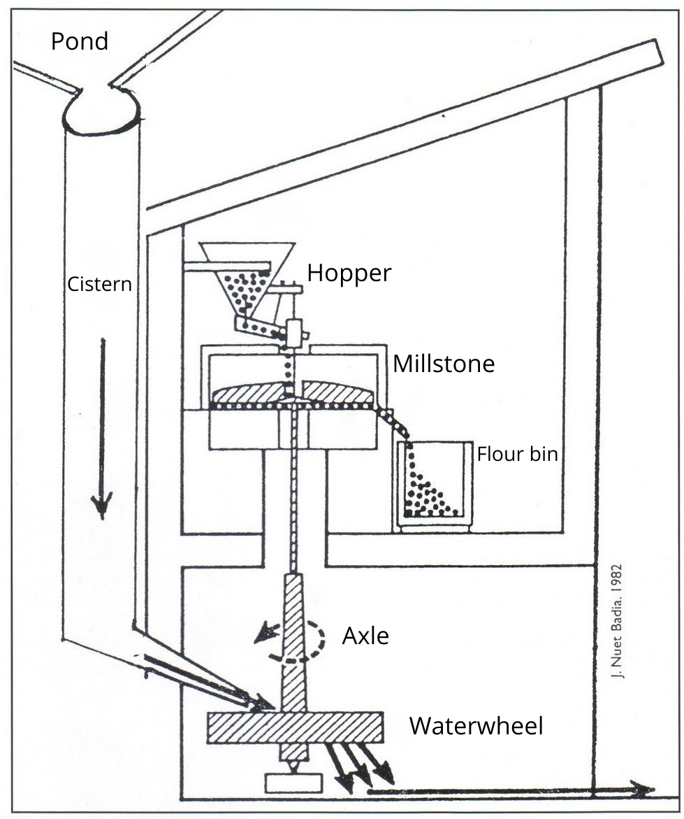 Plan of a watermill.For the operation of this type of mill, water was delivered via a canal from another mill or from a weir and entered the accumulation pond. This pond had a spillway, which allowed excess water to be discharged if necessary. From the pond, the water passed to a cistern which held it back, releasing it slowly through a small opening called ‘sagetilla’, until it reached the waterwheel. This wheel was connected to an axle which powered all the mill's mechanisms. Finally, the water exited through some arches called ‘cacaus’ and, via a canal, it was diverted to another mill or used for irrigation.